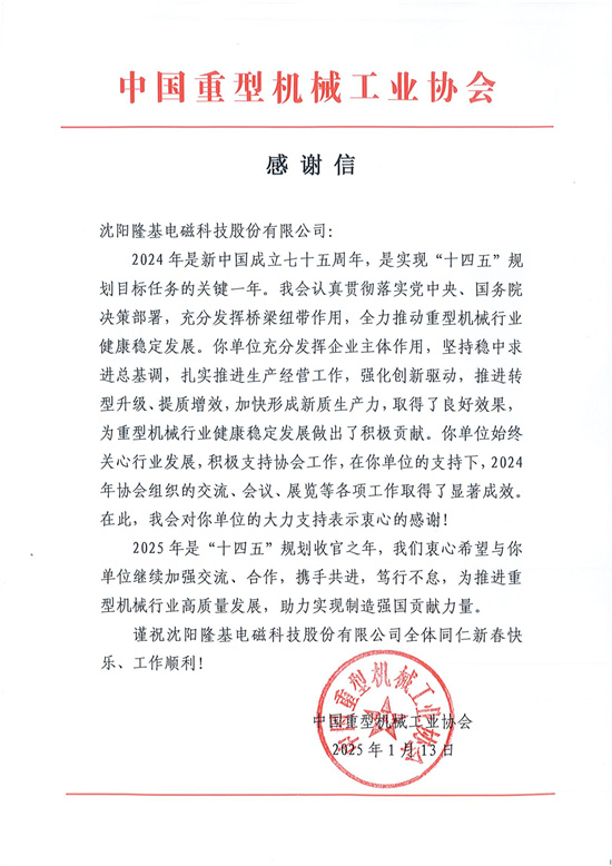 近日,沈陽(yáng)隆基收到中國(guó)重型機(jī)械工業(yè)協(xié)會(huì)發(fā)來(lái)的感謝信。 2025-01-13