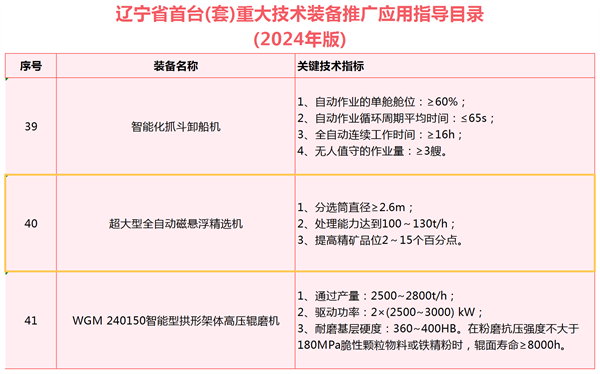 日前,遼寧省工業(yè)和信息化廳正式公示了2024年遼寧省首臺(tái)(套)重大技術(shù)裝備推廣應(yīng)用指導(dǎo)目錄。在這份備受矚目的名單中,沈陽(yáng)隆基自主研發(fā)的超大型全自動(dòng)磁懸浮精選機(jī)脫穎而出,成功入選。首臺(tái)(套)重大技術(shù)裝備,作為實(shí)現(xiàn)重大技術(shù)突破、擁有知識(shí)產(chǎn)權(quán)的裝備產(chǎn)品,一直以來(lái)都是裝備制造業(yè)高質(zhì)量發(fā)展的風(fēng)向標(biāo)。長(zhǎng)期以來(lái),沈陽(yáng)隆基積極推動(dòng)技術(shù)裝備創(chuàng)新變革,加快推動(dòng)磁選設(shè)備大型化、智能化、綠色化發(fā)展,持續(xù)激活發(fā)展新動(dòng)能。此次入選的超大型全自動(dòng)磁懸浮精選機(jī),正是沈陽(yáng)隆基創(chuàng)新成果的杰出代表。