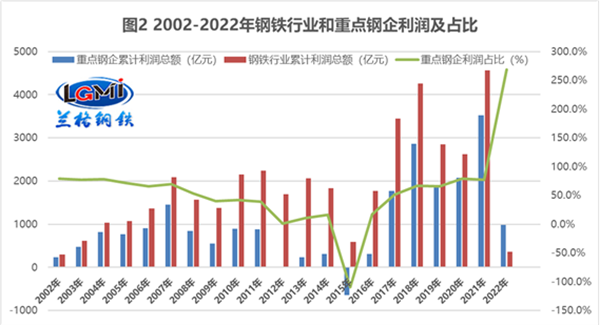 其一,從粗鋼產(chǎn)量數(shù)據(jù)來看,2022年全國粗鋼產(chǎn)量10.13億噸,其中重點(diǎn)鋼企粗鋼產(chǎn)量8.15億噸,占總產(chǎn)量的80.5%(詳見圖1)。從營收數(shù)據(jù)來看,2022年鋼鐵行業(yè)實(shí)現(xiàn)營業(yè)收入87147億元,其中重點(diǎn)鋼企實(shí)現(xiàn)營業(yè)收入65875億元,占總營收的75.6%。從銷售利潤率數(shù)據(jù)來看,2022年鋼鐵行業(yè)全年的銷售利潤率僅僅為0.4%,而重點(diǎn)鋼企的銷售利潤率為1.5%,高出整體行業(yè)1.1個(gè)百分點(diǎn)。從利潤數(shù)據(jù)來看,2022年鋼鐵行業(yè)實(shí)現(xiàn)利潤總額365.5億元,其中重點(diǎn)鋼企實(shí)現(xiàn)利潤總額982億元,重點(diǎn)鋼企的利潤總額竟然高出整體行業(yè)如此之多(詳見圖2),而作為鋼企龍頭的中國寶武去年實(shí)現(xiàn)利潤總額312.8億元,占重點(diǎn)鋼企利潤的31.8%;而暫居鋼鐵行業(yè)利潤榜第二位的湖南鋼鐵集團(tuán)實(shí)現(xiàn)利潤總額150.3億元,占重點(diǎn)鋼企利潤的15.3%;中國寶武和湖南鋼鐵集團(tuán)總計(jì)的利潤占比達(dá)到了47.1%,近半壁江山,這表明國內(nèi)鋼鐵行業(yè)兼并重組的效應(yīng)正在深度發(fā)酵著,八成的產(chǎn)量實(shí)現(xiàn)了七成的營收更實(shí)現(xiàn)了鋼企利潤的明顯提升。