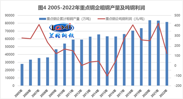 其二,從噸鋼利潤數(shù)據(jù)來看,2022年整體鋼鐵行業(yè)噸鋼利潤呈現(xiàn)快速下降的態(tài)勢,全年的噸鋼利潤僅在五十元左右(詳見圖3),而重點(diǎn)鋼企的的噸鋼利潤可以達(dá)到百元左右(詳見圖4),這表明在鋼材市場大幅波動的環(huán)境中,大中型鋼鐵生產(chǎn)企業(yè)的抗風(fēng)險(xiǎn)能力明顯增強(qiáng),同時(shí)也表明了這幾年鋼企針對下游需求變化而進(jìn)行的產(chǎn)品結(jié)構(gòu)調(diào)整正在發(fā)揮著有效作用。