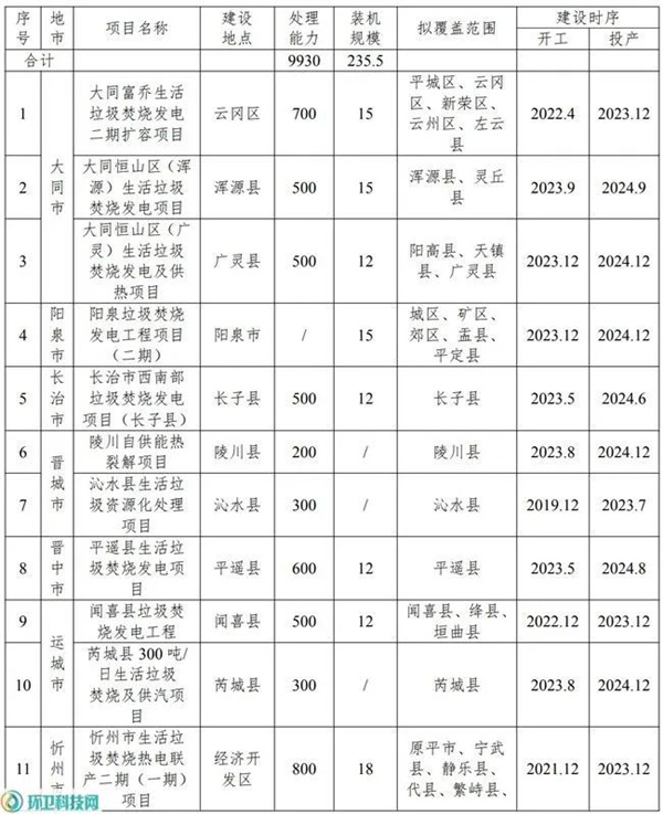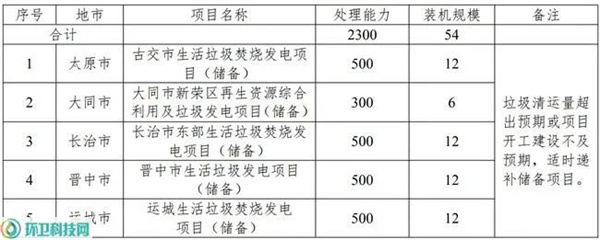 山西省生活垃圾焚燒發(fā)電儲備項(xiàng)目表(單位:噸/日、兆瓦)