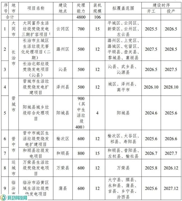表2 山西省2023-2025年生活垃圾焚燒項(xiàng)目表(單位:噸/日、兆瓦)